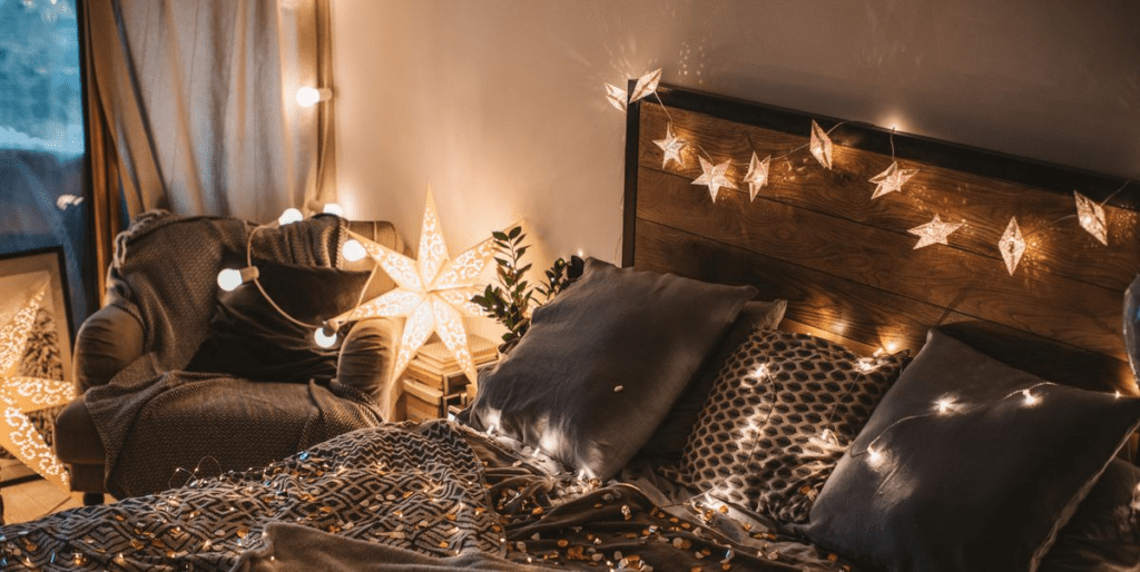 Keep the brighter, overhead lights off in the evening. Instead use a softer and dimmer bedside lamp. You can also string fairy lights over your bed for a soft glow. There’s nothing worse than having to get out of your warm bed and turn the lights off before going to bed. Place lamps and fairy lights within reach so you can just reach out and turn them off.