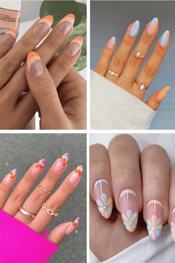 On a nude base these orange, purple and pink nails stand out for a bold look. The best thing about this design is that it works on any nail shape and skin tone.